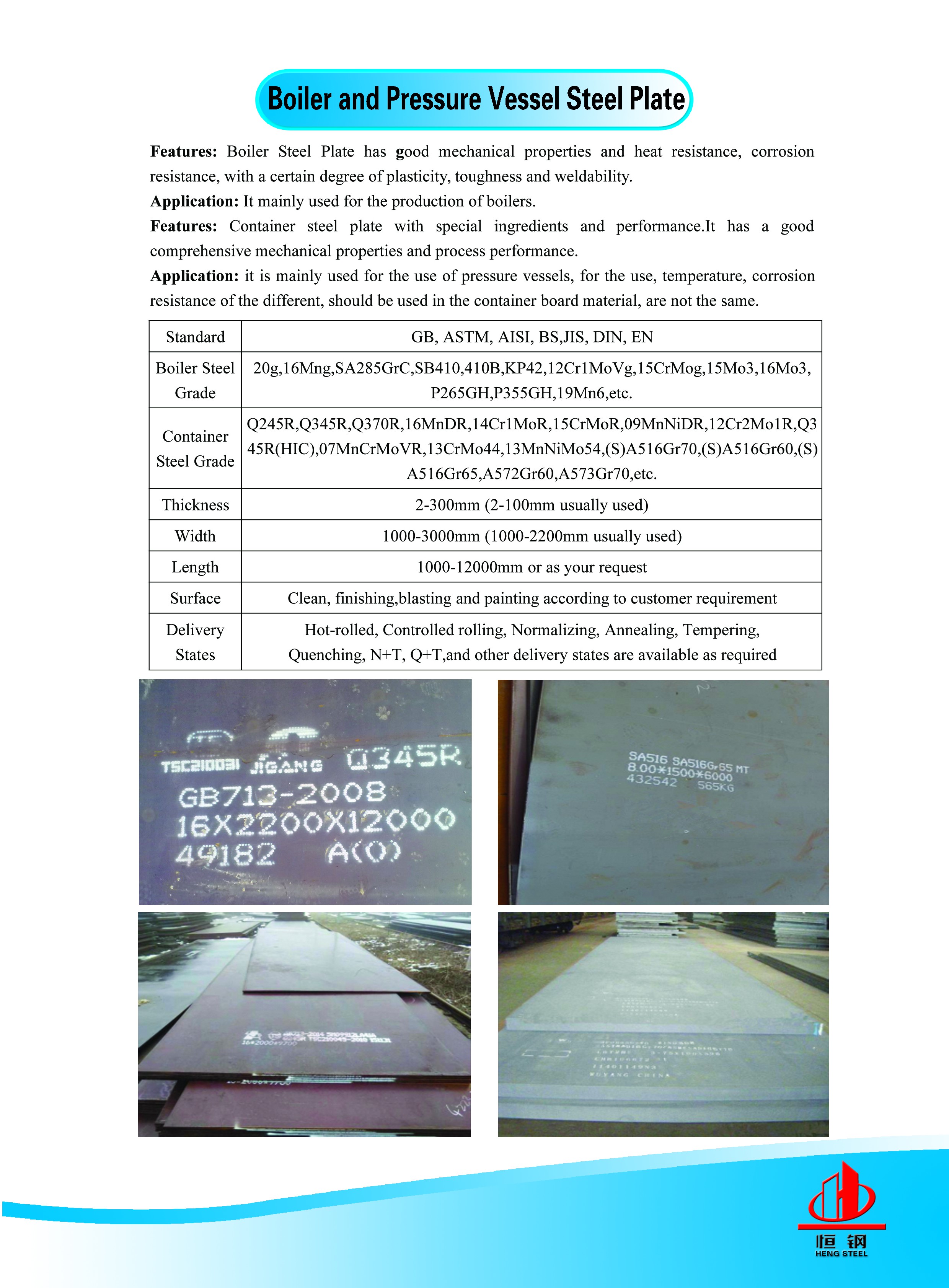 1) Delivery Condition:CR,HR,Normalizing, Annealing,Tempering,Q+T,N+T 2) Surface Treatment:Shotblast sandblasting paint 3) Material:Q245R、Q345R、Q370R、15CrMoR、12Cr1MoVR、A516Gr 55 60 65 70,A517Gr B etc